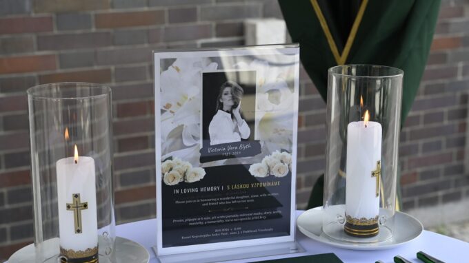 U fotografie zesnulé Victorie stál vzkaz od pozůstalých. "Prosím, připojte se k nám, při uctění památky milované matky, dcery, sestry, manželky a kamarádky, která nás opustila příliš brzy."